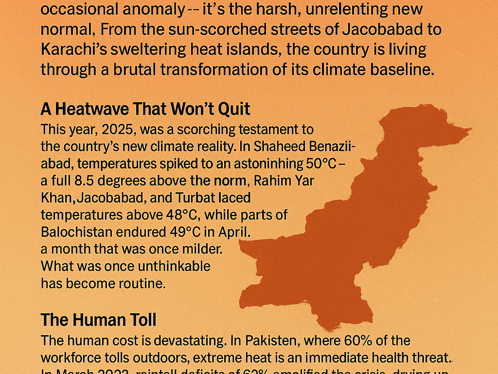 In Pakistan, record-breaking heat is no longer an occasional anomaly — it’s the harsh, unrelenting new normal. From the sun-scorched streets of Jacobabad to Karachi’s sweltering heat islands, the country is living through a brutal transformation of its climate baseline.